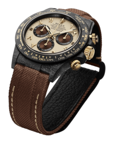 The Daytona Arabic Brown perfectly highlights the traits of its owner: exclusive and aesthetically perfect. When the “Military” series is taken into a new different level. The 18K Gold elements match with its overall style, the case is crafted in high-end carbon fiber.